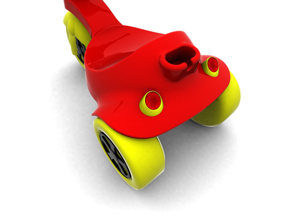En base a la morfología y estética del producto a intervenir, se diseño un carenado frontal para un triciclo a pedal. Este debía permitir su fácil instalación y contemplar áreas para aplicación de grafica/calcomanías. Se genero un modelo en 3D para su posterior mecanizado CNC de la matricería para inyección de plástico.