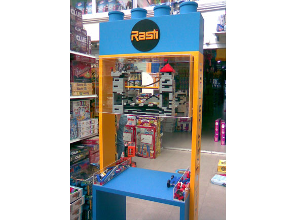 Se realizó el diseño y producción de un exhibidor provisto de un área de juego y una mesa desmontable. Este tiene una cúpula para exhibición de distintos modelos armados de la línea Rasti. El mismo permite desplazar la mesa de juego para ser utilizada y ser guardada debajo del exhibidor en los momentos que no se utiliza. Se diseño un modelo en 3D para presentación de propuestas al cliente y posterior producción.
